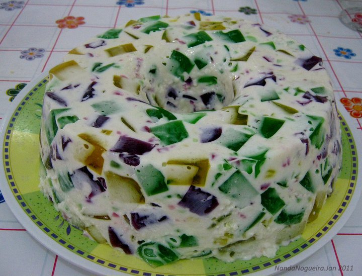 TORTA DE GELATINA COLORIDA Tá geladinha... Leite condensado com gelatina colorida. Qué? Receita capturada no facebook através da amiga NANDA NOGUEIRA...Que ilustra o painel do blog "Dica de Mim" Não sou muito boa pra escrever receitas, vou escrevendo do jeito que eu faço a gelatina, ok? ...OBS: Esta é uma receita ideal para fazer e comer no dia seguinte. Faço à noite para comer no dia seguinte, ela fica na consistência ideal. Se quiser fazer DE HOJE PARA HOJE, com certeza não vai dar certo... Ingredientes: • 1 pacote de gelatina vermelha (cereja ou morango) • 1 pacote de gelatina amarela (abacaxi) • 1 pacote de gelatina verde (limão) Se quiser uma 4ª cor, use mais 1 pacote de gelatina uva. • 1 lata de leite condensado • 1 lata de creme de leite • 1 pacote e meio de gelatina em pó, sem sabor (para 3 cores) • 1 pacote de gelatina em pó, sem sabor (para 4 cores) Mãos à obra: • Fazer as gelatinas em separado, separadas, num pirex baixo (o quadrado é o melhor) para que a gelatina fique no máximo com 2 cm de altura depois que endurecer. Depois que estiver bem durinha, cortá-las em cubinhos (com faca) - ainda no pirex. Reservar (deixe na parte de baixo da geladeira para não amolecer). • Misturar o leite condensado e o creme de leite em uma vasilha à parte – fazer só depois que as gelatinas estiverem duras e cortadas, senão não dá certo. Melhor misturar com uma colher de borracha ou silicone, para não machucar a gelatina. • Dissolver a gelatina em pó em meio copinho (de requeijão) de água MORNA. Dissolver bem, e colocar na mistura do leite condensado. COM MUITO CARINHO E CUIDADO misturar, com colher de borracha ou silicone, as gelatinas coloridas no creme já misturado tb, e coloca tudo na forma. Gosto das formas de silicone porque ficam com desenhos, a obra prima fica mais bonita no final (As daqui de casa estavam sendo utilizadas então não deu pra fazer na de silicone, foi na de alumínio mesmo). Levar para a geladeira e deixa lá, quietinha, pelo menos durante 8 a 10 horas. (Não gosto de colocar no freezer, porque gela rápido demais e às vezes o meio da torta fica meio molenga, não fica boa para corte). Depois é só virar no prato e servir. MAS... Se der tudo errado e você não conseguir virar sem quebrar, jogue tudo no liquidificador e bata bastante, vira um IOGURTE delicioso... Já aconteceu comigo, e para não perder inventei o IOGURTE DE GELATINA, e a turminha daqui adorou !!!!!! rs... Depois me contem, ok? Beijos e UM FELIZ 2011 !!!!!!!!Ver mais